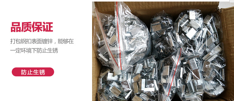 4、最后持剪刀將打包帶剪斷。塑鋼打包扣各種規格型號的pet塑鋼打包扣,扣子表面經鍍鋅處理,內部齒高、密,拉力可達400公斤以上,打包后不易脫落。主要規格有0.6*16mm、0.8*16mm、0.8*19mm、1.0*19mm.被廣泛用于:物流,電子,木業等各大行業。是出口產品當中首. 特性:本產品通過PP高強度打包帶結合打包扣根據物理原理達到緊固包裝的目的,可承受80公斤以上拉力強度,具有強度高、韌性好、質量穩定、綠色環保的特點。打包扣替代傳統的尼龍繩及手工打包帶包裝方式,可在不持任何工具情況下進行包裝使用,操作簡單、攜帶方便,并可重復使用,是各類包裝耗材、辦公用品及外出旅游的首選產品。 本產品通過PP高強度打包帶結合打包扣根據物理原理達到緊固包裝的目的,可承受40公斤以上拉力強度,具有強度高、韌性好、質量穩定、綠色環保的特點 鐵皮打包扣選用寶鋼專用帶鋼,內有密麻小刺,起到防滑、增加聯系處拉力、保障貨物安全的效果。打包鐵扣表面鍍鋅,能夠防止生銹。規格在寬度13-19mm,厚度0.6-1.0mm之間,可根據打包帶規格進行配套使用。鐵皮打包扣必須用專用的打包機打包。供應打包扣為:PP帶專用鐵扣、PET打包帶專用扣、塑料打包扣(環保型)