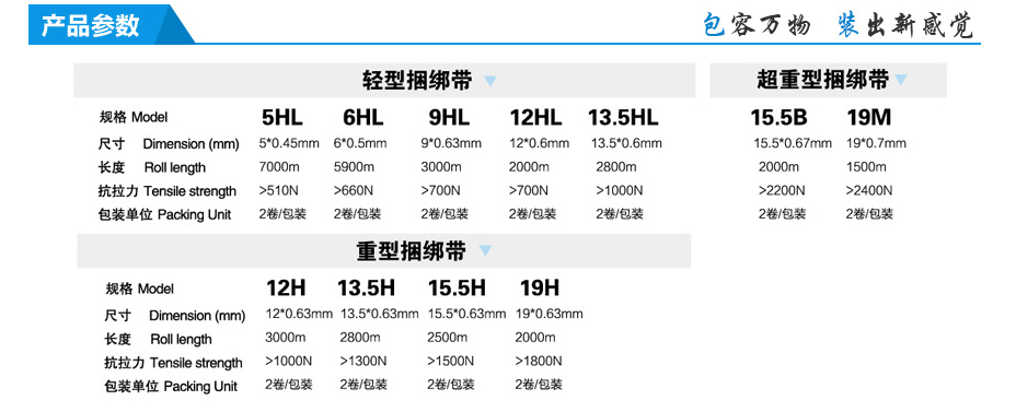 完全使用新料制成,比重輕,相同重量,長(zhǎng)度,物美價(jià)廉。本產(chǎn)品配合全自動(dòng)及無(wú)人化捆包機(jī)使用效率最佳。