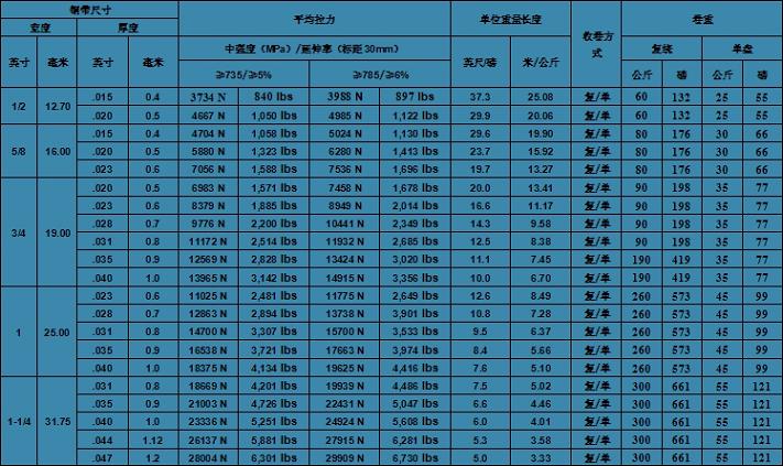 8 平均強(qiáng)度:每種尺寸鋼帶的平均強(qiáng)度都是通過大量試驗(yàn)數(shù)據(jù)得出.特殊鋼帶樣品強(qiáng)度可能高于或低于上述強(qiáng)度.