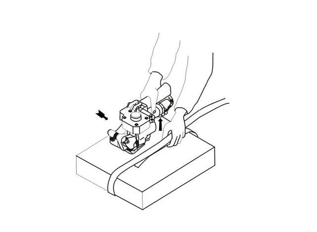 2,機器插入熱熔帶右手握住手柄和張緊器以保證緊輪與壓板掛齒間張開最大。將熱熔帶的上,下部分同時插入打包機中。